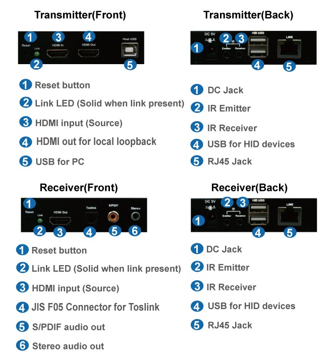 | USB HID仿真,三重音頻線路輸出(光纖跳線/ SPDIF /立體聲)和雙向IR通過單一CAT-5e / 6類電纜。 |