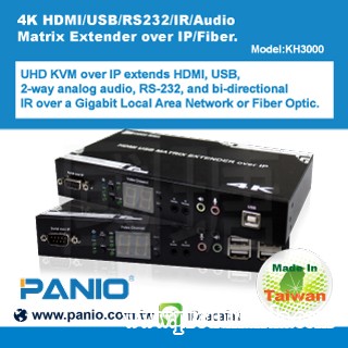 KH3000 is the UHD KVM over IP extends HDMI, USB, 2-way analog audio, RS-232, and bi-directional IR over a Gigabit Local Area Network or Fiber Optic.